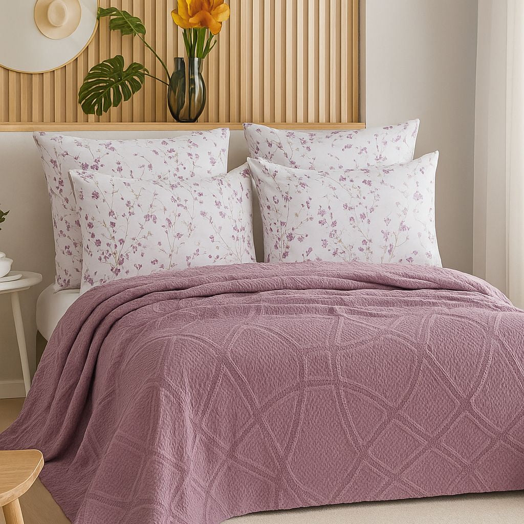 • غطاء سرير بنفسجي أنيق بملمس ناعم ونقشة هندسية بارزة.